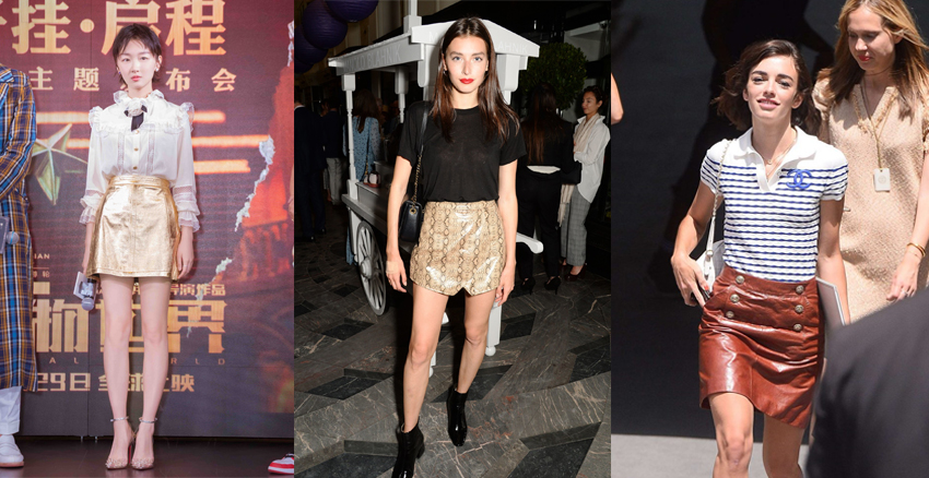 繽紛的彩色皮裙搭配起來就是可愛青春,看看周冬雨(右)的香檳金皮裙搭配公主袖襯衫,就是時尚宮廷風;美妝博主Jessica Clements(中)的圖騰皮裙配上黑T,感覺特別有個性;阿根廷模特兒Belen Chavanne(右)搭配Chanel Polo衫打造貴族學生風格。