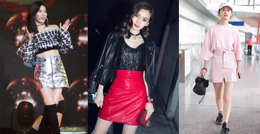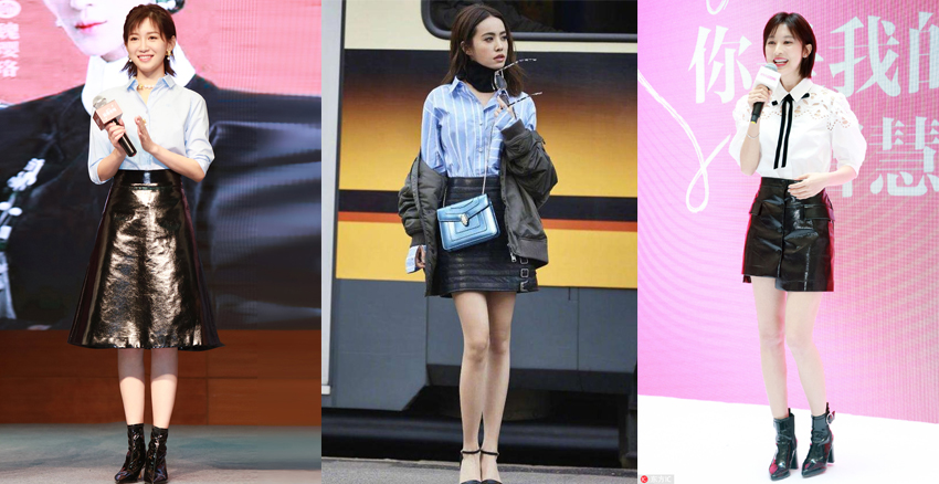 秀智(左)的一字肩上衣與銀色皮裙搭配起來超性感,搭大腿靴超辣;Angelababy(中)的紅色皮裙撞色黑色皮夾克,即便什麼都沒露但性感指數爆表;元淳公主—李沁(右)的粉紅色皮裙超級可愛,搭配同色上衣根本是女大生,戴上鴨舌帽更減齡。