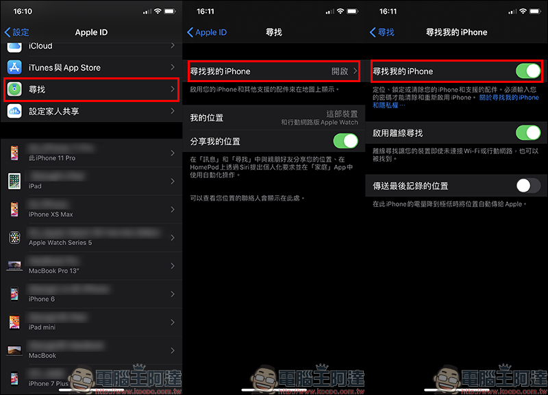 當有心人取得你的 iPhone 並解鎖 iPhone ,也已經更改了 iCloud(Apple ID)密碼,此時他就能直接在帳號頁面(Apple ID)直接前往「尋找」將 Find My iPhone 功能直接關閉: