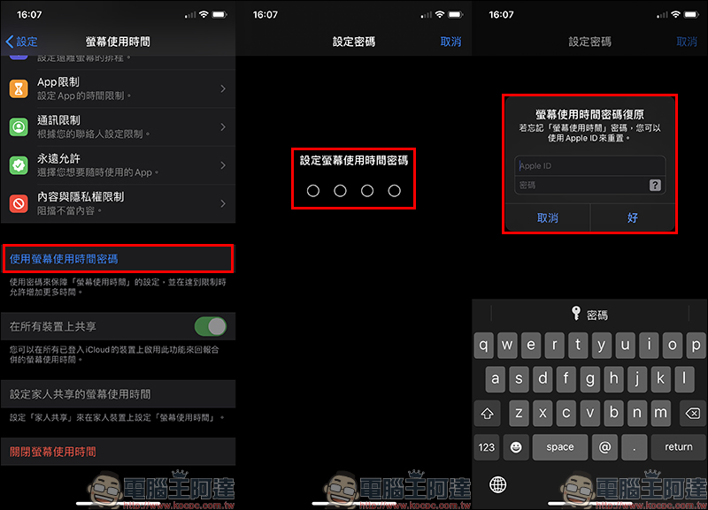另外,為防止「螢幕使用時就密碼」被破解,除了不要使用生日或其他容易被猜到的數字密碼,同時也不要將「螢幕鎖定密碼」和「螢幕使用時間密碼」使用一樣的密碼: