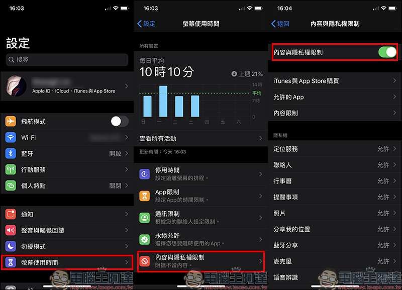 其實要預防這問題相當容易,首先在設定頁面點擊「螢幕使用時間」,接著點選「內容與隱私權限制」將這項功能開啟: