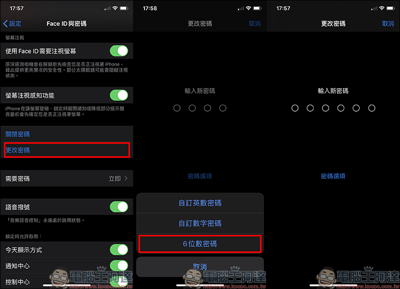 因此筆者也建議各位,螢幕解鎖密碼還是以「6 位數密碼」為優先選擇,且並避免 6 位數密碼的前 4 位數與「螢幕使用時間密碼」相同。若想進一步提升解鎖安全,可將密碼改為「自訂英數密碼」或「自訂數字密碼」作為螢幕解鎖密碼: