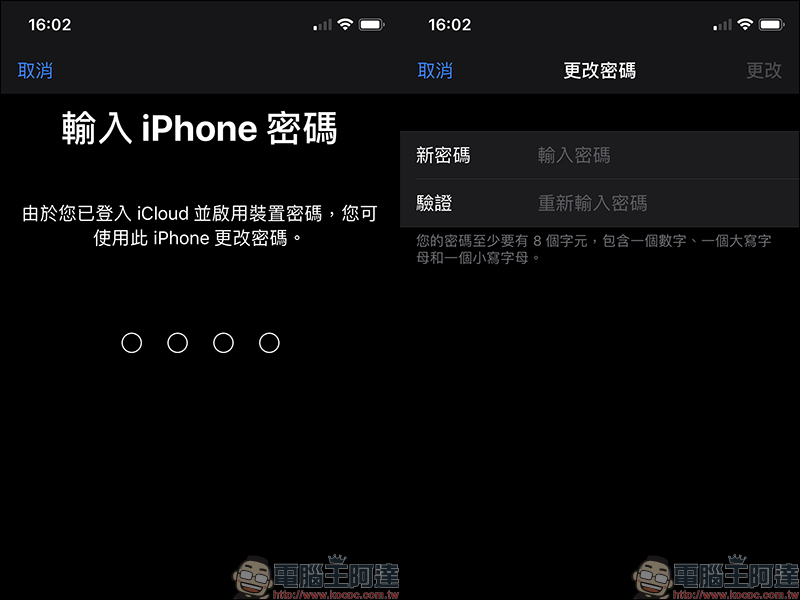 可以看到依循上述的步驟進入帳號變更密碼,畫面會顯示「由於您已登入 iCloud 並啟用裝置密碼,您可使用此 iPhone 更改密碼」。此時只要輸入 iPhone 的解鎖密碼,就能直接通過認證直接更改 iCloud (Apple ID)密碼: