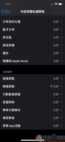 設定完螢幕使用時間密碼後,若他人想要在內容於隱私權限制變更任何設定,都必須輸入這項密碼才能變更,也能進一步增加隱私安全: