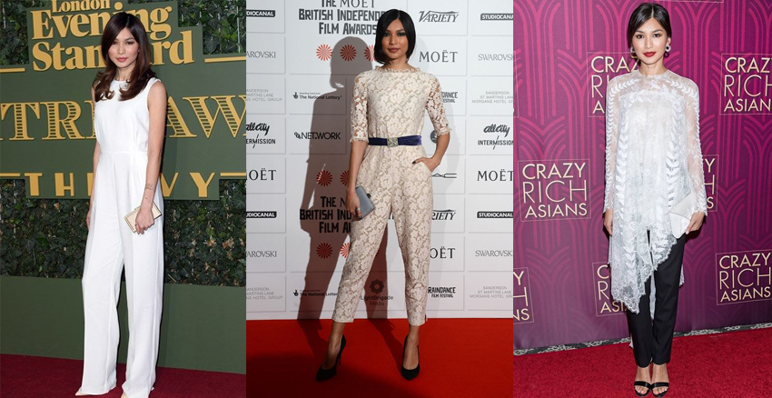 (左)白色連身褲的下身以寬褲設計拉腿部線條,非常聰明;(中)蕾絲連身褲的精髓在於腰帶,打造出逆天長腿;(右)近年潮人瘋追的洋裝內搭褲風格,陳靜也駕馭得很好,果然是時髦精無誤。