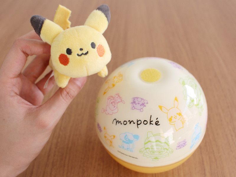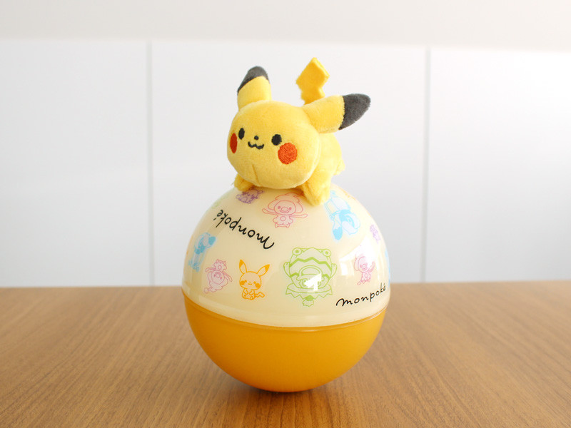 還有一款「皮卡丘球型玩具」,塑膠球上有著一隻趴著的皮卡丘娃娃,輕輕推動塑膠球就會有鈴鐺柔和的聲音,而且皮卡丘娃娃還是可以拆下來的!就算只是放在桌上也可愛到不行啊~