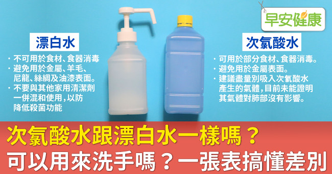 存放注意事項 | 1.稀釋的漂白水存放時間越長分解量越多,降低殺菌能力,最好在24小時內用完。 2.未經稀釋的漂白水在太陽光下會釋出有毒氣體,應放置於陰涼處。 3.應放置兒童接觸不到的地方,以免誤食風險。 | 1.次氯酸水照光容易分解,如果沒有使用不透光容器分裝,久放會失去消毒效果。 2.應放置兒童接觸不到的地方,以免誤食風險。 |