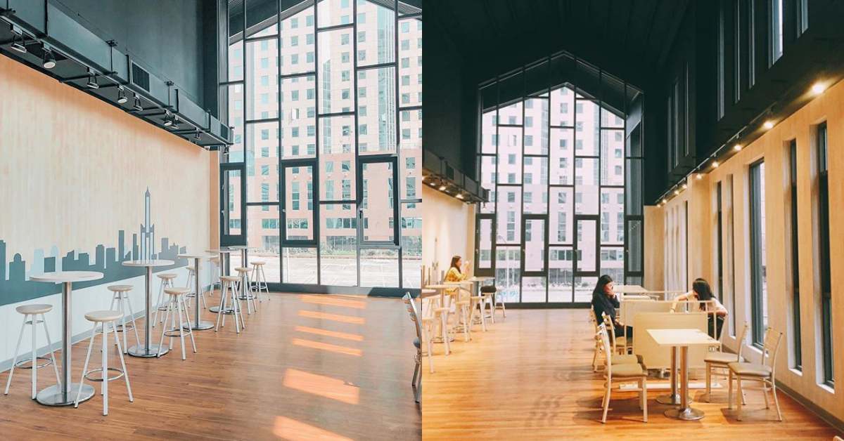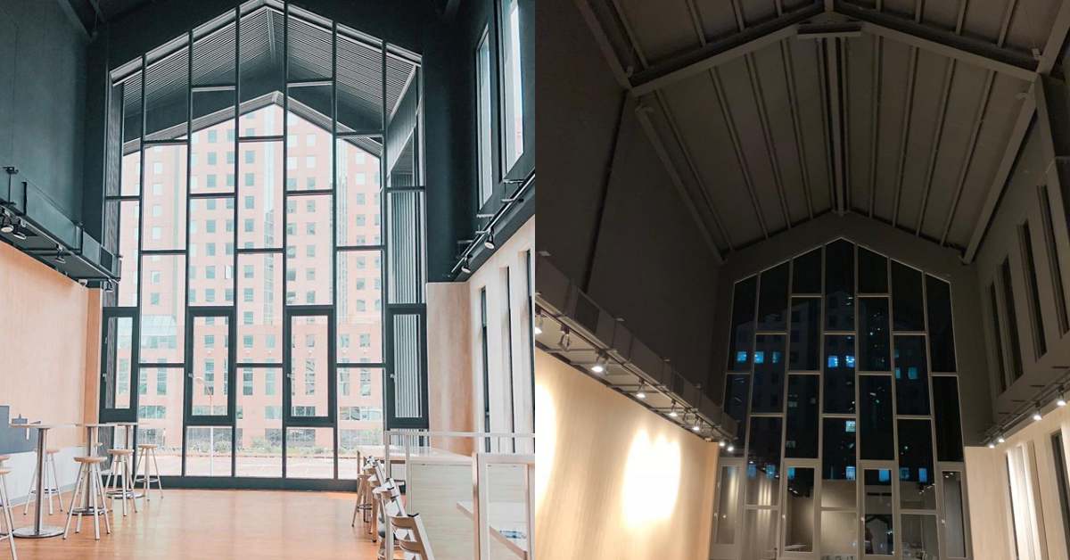 雖然外觀看起來是工業風,但裡面的超大落地窗就像是歐風的教堂一樣,為了講究完美採光,《亞新灣門市》特別將2.3樓打通讓陽光能完全照射進來,白天時陽光灑下更是美到不行,好想躺在這裡曬太陽啊~而到晚上雖然就看不到美麗的陽光,但依然會被它大超大落地窗美到,空曠且舒適的環境讓人倍感舒適!