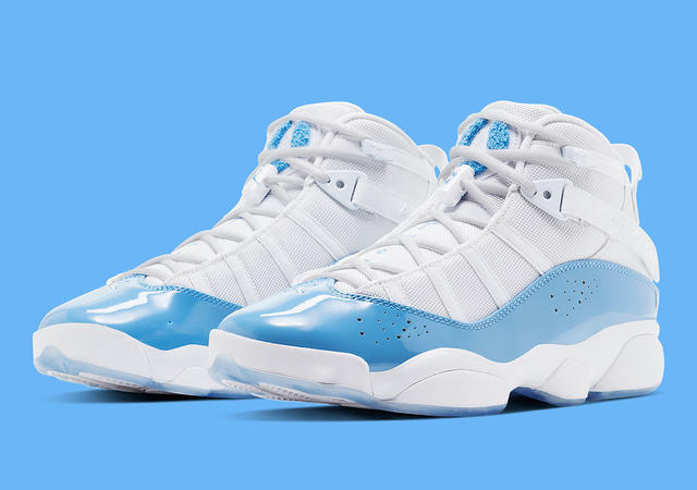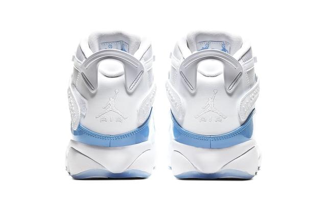 Jordan 6 Rings整體輪廓與AJ 11相似,細節處則融合了數代的AJ鞋款,整雙鞋採用白色為基調,鞋面漆皮注入清新的天空藍,鞋舌上的飛人LOGO周邊以絨毛質料點綴,鞋後跟添加了堅固耐用的橡膠片,與若隱若現的白色商邊並排呈現。