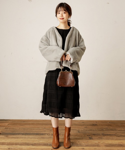 選擇仿皮草外套+長洋裝的造型組合,不僅是懶女孩最愛的百搭必備,利用裙裝與短靴點綴輕鬆營造輕貴氣形象,隨性拎個手拿包即是適合見男友長輩的穿著。