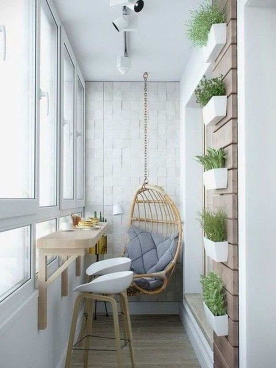 針對長條型,且是密閉設計的陽台,若能在牆邊加裝小邊几,那麼就可以讓陽台搖身一變成為悠閒享用點心或早餐的地方,再放上一把高腳椅或是懸掛一座吊椅,整個度假氣氛就都出來了。