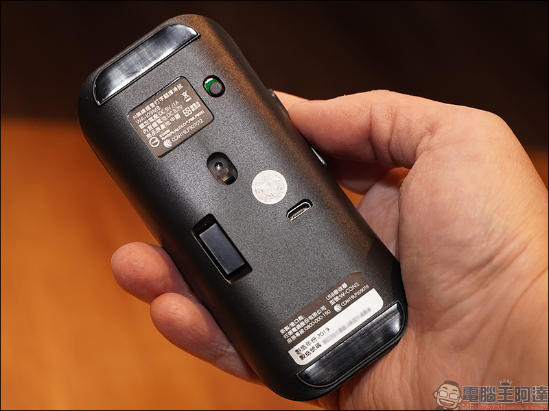 滑鼠底部可以看到配備了電源開關、光學滑鼠光標與 Micro-USB 充電口,另外 WA-I09MB 的 2.4G 無線接收器收納槽也設計於此處。 WA-I09MB 靈敏度最高支援 1600DPI 、內建 600mAh 鋰電池,無線距離最長可達 10 公尺。系統方面,支援 Windows 和 Mac 雙系統: