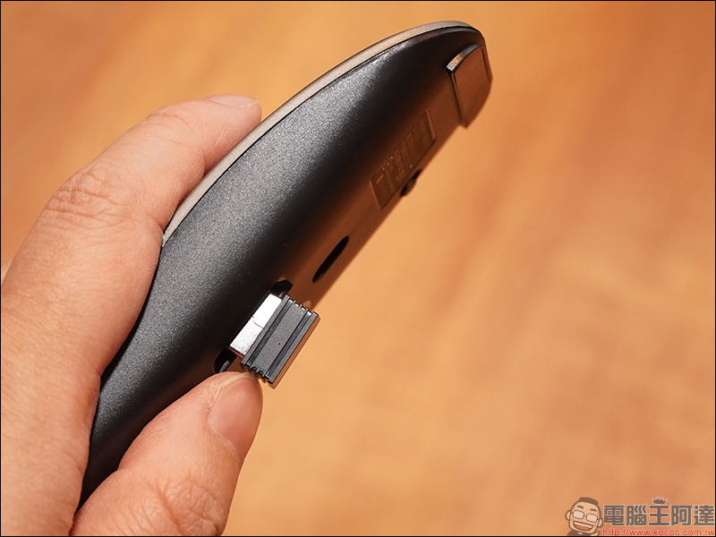 打開電池收納蓋後,內部分別收納了 14500 鋰電池和 2.4G 無線接收器,將接收器隱藏在電池槽內的設計,更能讓使用者不擔心不小心將接收器弄丟的問題。