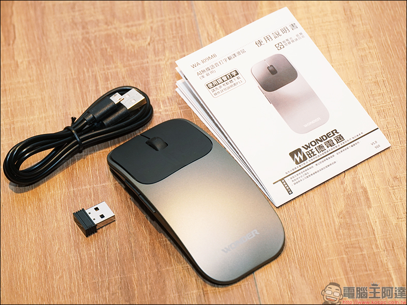 WA-I09MB 的內容物如下,分別為滑鼠本體、 2.4G 無線接收器、 Micro-USB 充電線及使用說明書: