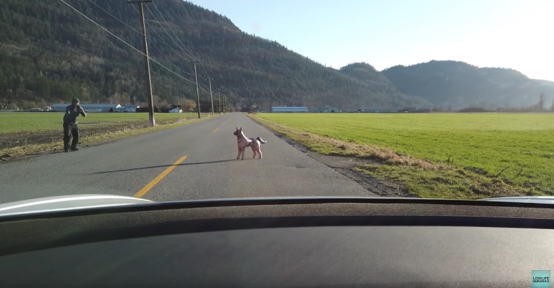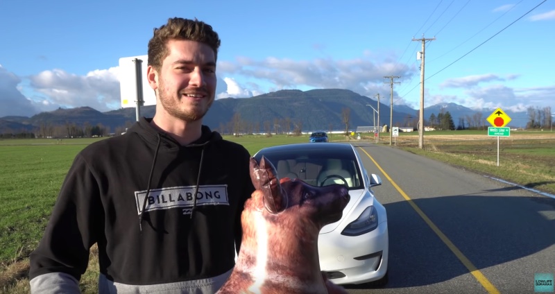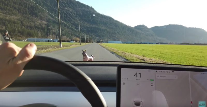 首先是狗狗,他們使用當然是假的氣球狗,如果直接擺在路中央,使用自動輔助駕駛模式往前開, Tesla Model 3 會偵測到前方有物體,進而保持一段距離就率先停住: