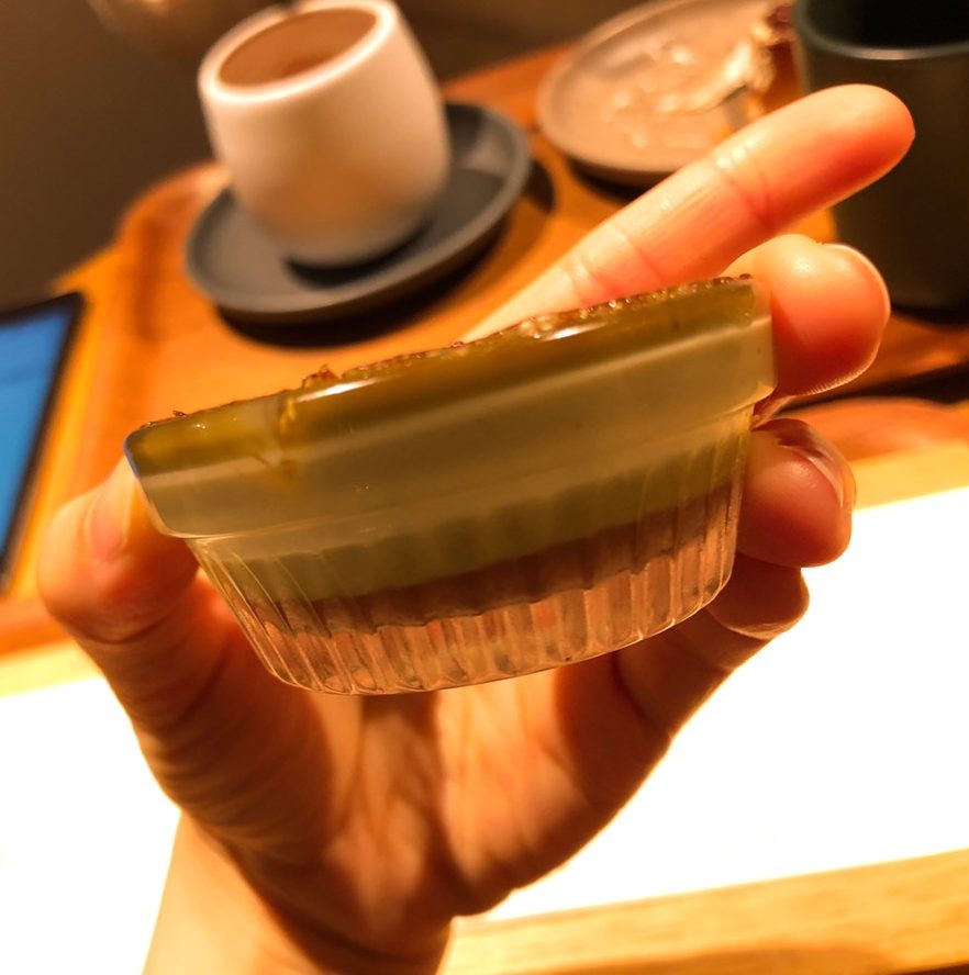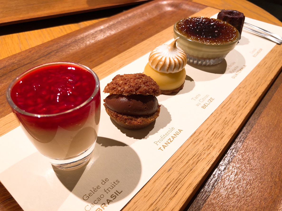 後來在店員的推薦下,點了藏前店每天限定30份ーCHEF’S TASTING,再配上熱茶讓味蕾可以稍作休息。端上桌,五個迷你點心一字排開,點心面前也都有對應的名稱及巧克力產地,超可愛。