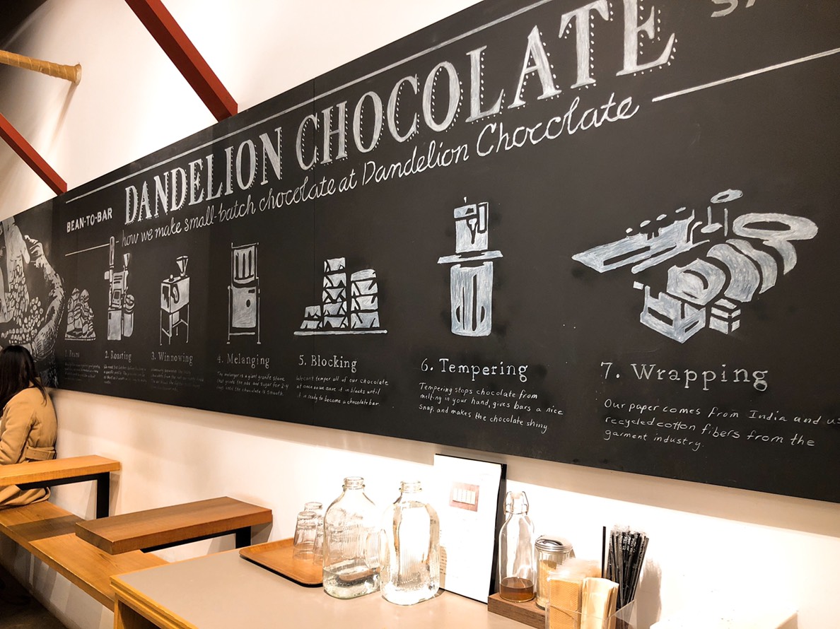 Dandelion Chocolate專賣店起源於美國舊金山,堅持” Bean to Bar ”的理念並將其引進日本並隨之帶起一陣旋風。Bean to Bar意指從可可豆的購買、選別、烘烤、研磨、調溫、鑄型、包裝等等,所有巧克力製程都一手包辦,將專業的巧克力工廠搬進咖啡廳,巧妙結合二者讓巧克力更貼近民眾的生活。