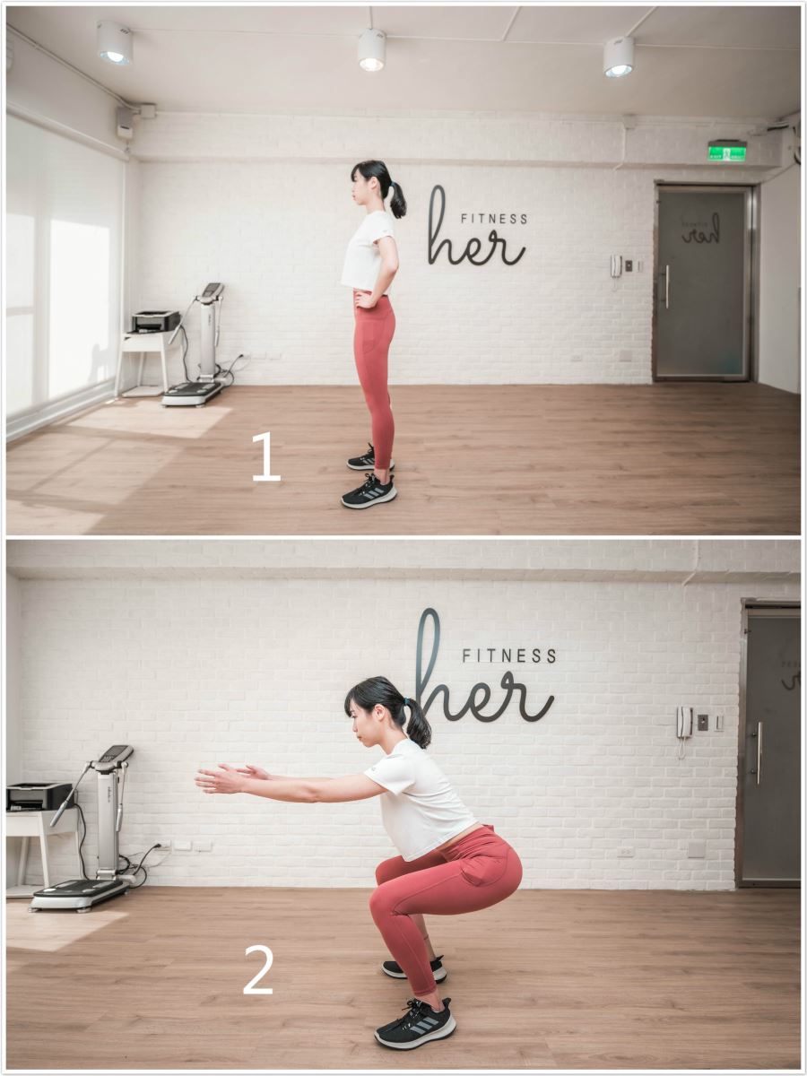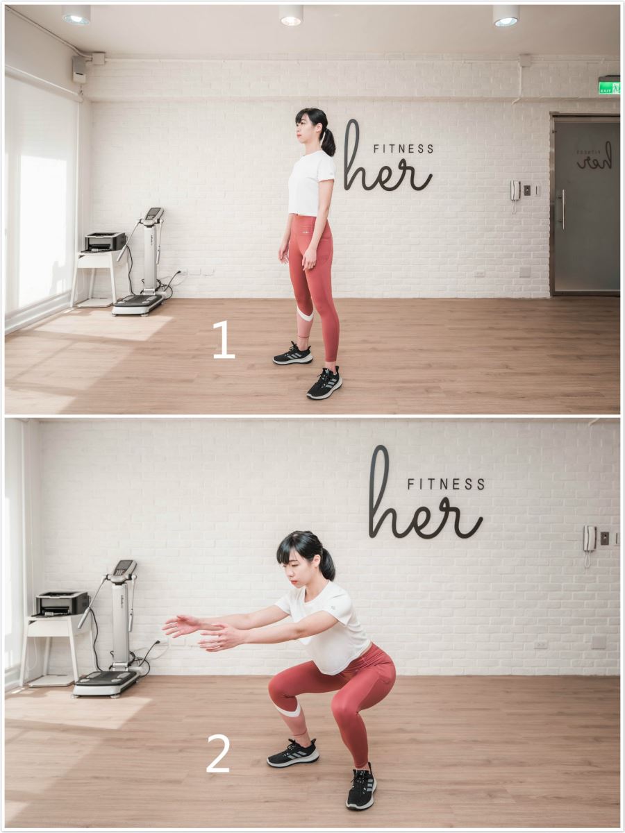 2. 身體垂直下蹲、雙膝彎曲90度