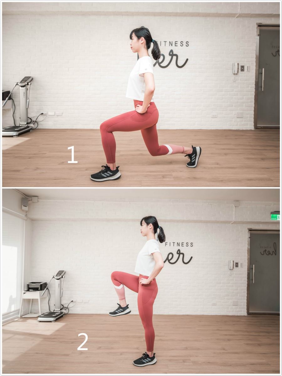 1. 軀幹打直、保持挺胸、後腳90度彎曲