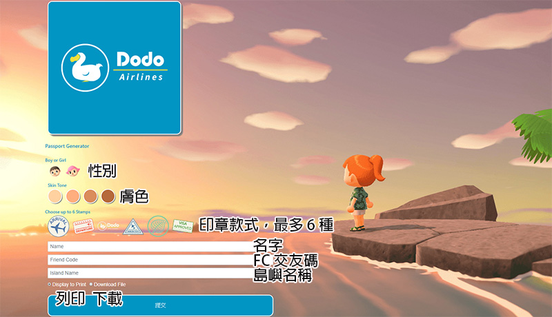 如果你想製作動物之森護照,在進入網站後點選「Creat Passport」這一項。進入頁面後你可以選取角色性別、皮膚顏色、海關印章等相關資訊,在你選擇膚色後還能選擇人物的外型。下面輸入名稱(任天堂帳號的名稱、遊戲內名稱,隨你喜歡)、你的 FC 碼跟島嶼名稱,也不失為另一個告訴別人你的 FC 碼的好方法!至少很可愛!
