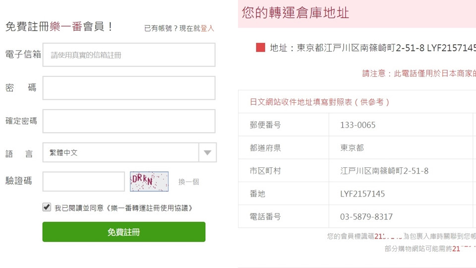 日本樂天除了官方轉運,也有和其他集運商合作,像是「樂一番」就是許多PTT網友大推的選擇,有許多運費優惠活動、關稅補貼等等貼心服務,只要申辦一個「樂一番」會員帳號,就能獲得一組日本當地轉運倉庫地址和電話等等資訊,讓你購買日本商品暢通無阻~