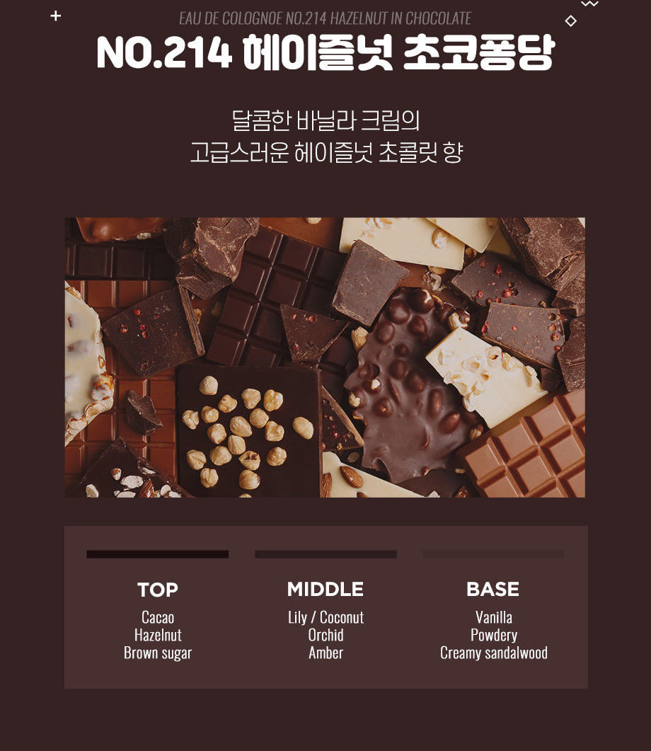 ETUDE HOUSE這次和韓國香水品牌W.DRESSROOM合作推出「巧克力香氛噴霧」,真的是沒有要放過巧克力控的意思!這款「No.214 榛子巧克力」巧克力香氛噴霧,一罐的容量為70ml,原本是為了2/14情人節推出,但實用性很高,就算情人節過了還是可以買來用!