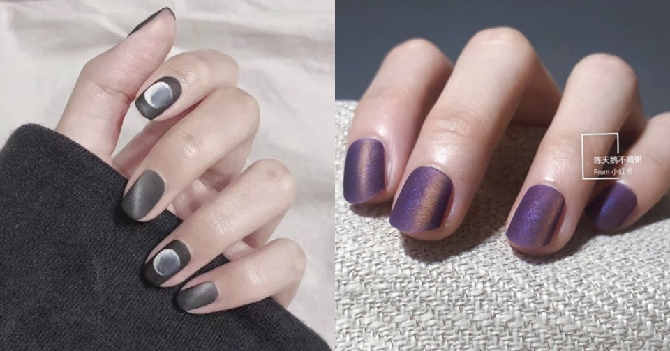 最後一款是超級特別的霧面磨砂款!雖然貓眼石美甲通常都搭配亮面、鏡面的底色,但是搭配霧面底色卻也意外的好看!這一款的貓眼石光暈會比較不明顯,但卻是低調的奢華,若隱若現的貓眼光讓指甲多了一點神祕感,搭配上黑色、紫色等深色底色,也不會顯雙手太過暗沉、暗黑,反而是很獨特酷炫美!