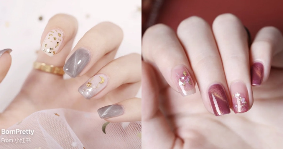 金箔和貓眼石其實都是美甲中常見的元素,但是兩者搭配在一起卻又美出新高度!金箔讓整體風格變得更溫柔優雅,貓眼石的色澤更是增加了這款美甲的亮點,讓手指頭看起來更耐看,但同時也很特別~如果想要圖樣看起來更豐富,也可以搭配小水鑽、亮片等綴飾,就更不容易撞甲!