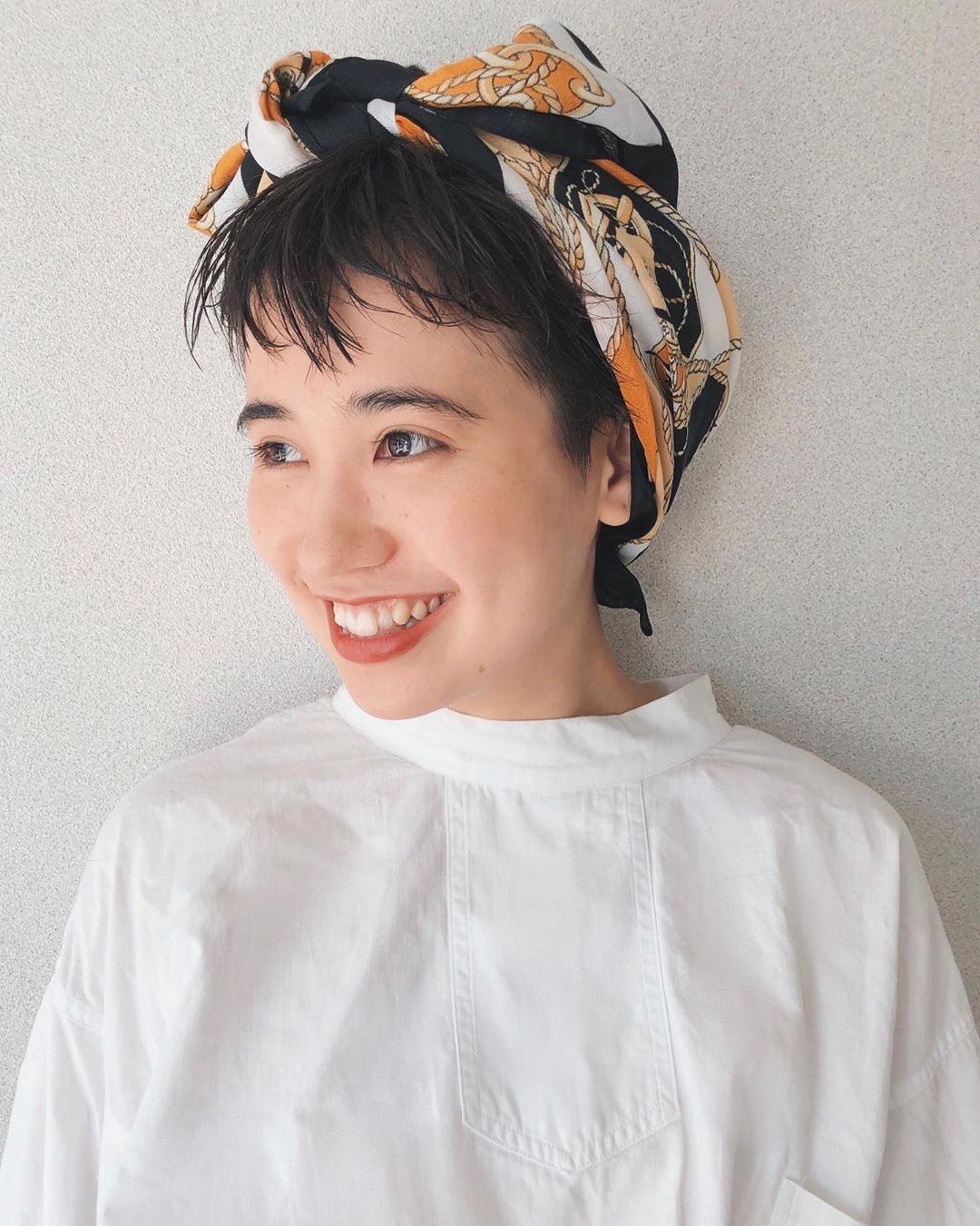 以往總覺得絲巾綁髮只限長髮造型,但其實短髮也可以利用絲巾點亮焦點,將絲巾褶成條狀後從髮頂到後腦勺繞圈,再簡單打個單結瞬間為整體注入格外注目的俏皮可愛氣息。