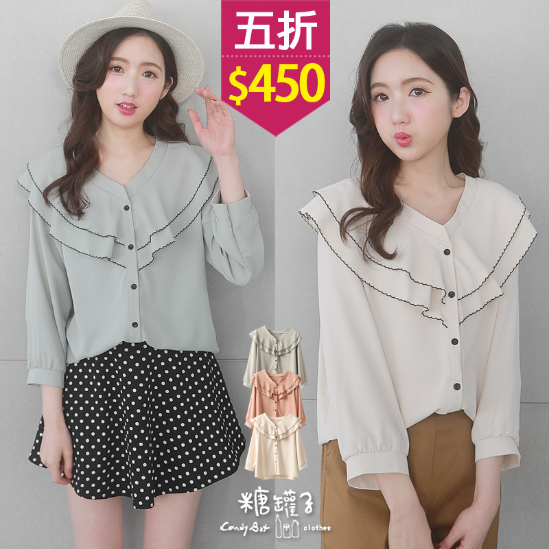 糖罐子 滾邊雙層荷葉V領排釦雪紡上衣