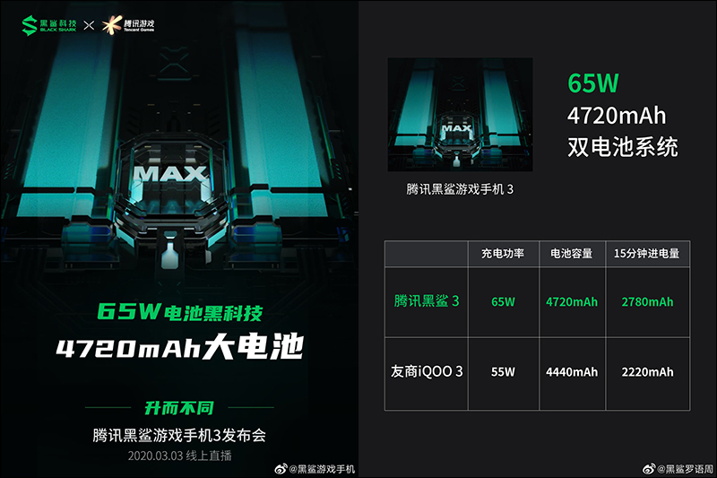電量方面,當初小米 10 系列發表時,雖然小米 10 Pro 標配一個 65W 充電器,但小米 10 Pro 僅支援到最高 50W 快充,也讓許多米粉感到有點可惜。不過在即將發表的黑鯊遊戲手機 3 ,則以確定支援最高 65W 有線快充,內建 4,720mAh 大電量電池。