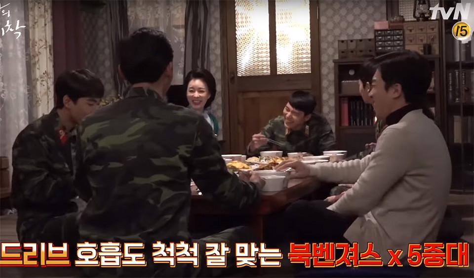 北韓大媽們也全都是戲精啊~正赫要退伍前,和大家一起吃飯,大媽們不捨正赫離開,瘋狂把肉都往正赫那邊端。