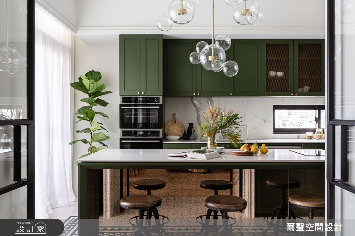 《愛的迫降》中世理豪宅的廚房則是另一處顯現豪宅設計品味的空間,劇裡廚具的選擇上就採用了飽和度高的綠色款式,結合新古典、美式風常見的線板元素,形成有質感又不突兀的生活場景,讓視線可以聚焦於女主角世理的一舉一動,而且還有夢幻的中島吧檯,真的是很想「寄生上流」住進她家呢!