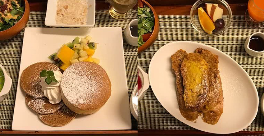 早餐有鬆餅、法式吐司之類的料理,還有一般常見的日式料理,從擺盤到料理的色澤度看來,都不輸外頭的高級餐廳!還以為他在哪家美食餐廳打卡?