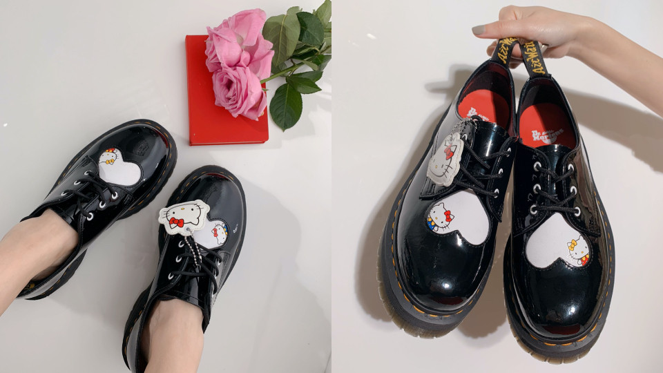 Dr. Martens x Hello Kitty 「1461鞋款」與厚底八孔一樣採用Quad鞋底,鞋面上是充滿驚喜的「不對稱的凱蒂貓」白色愛心設計,不論正看反看都像是竄出的Hello Kitty 給你滿滿療癒!