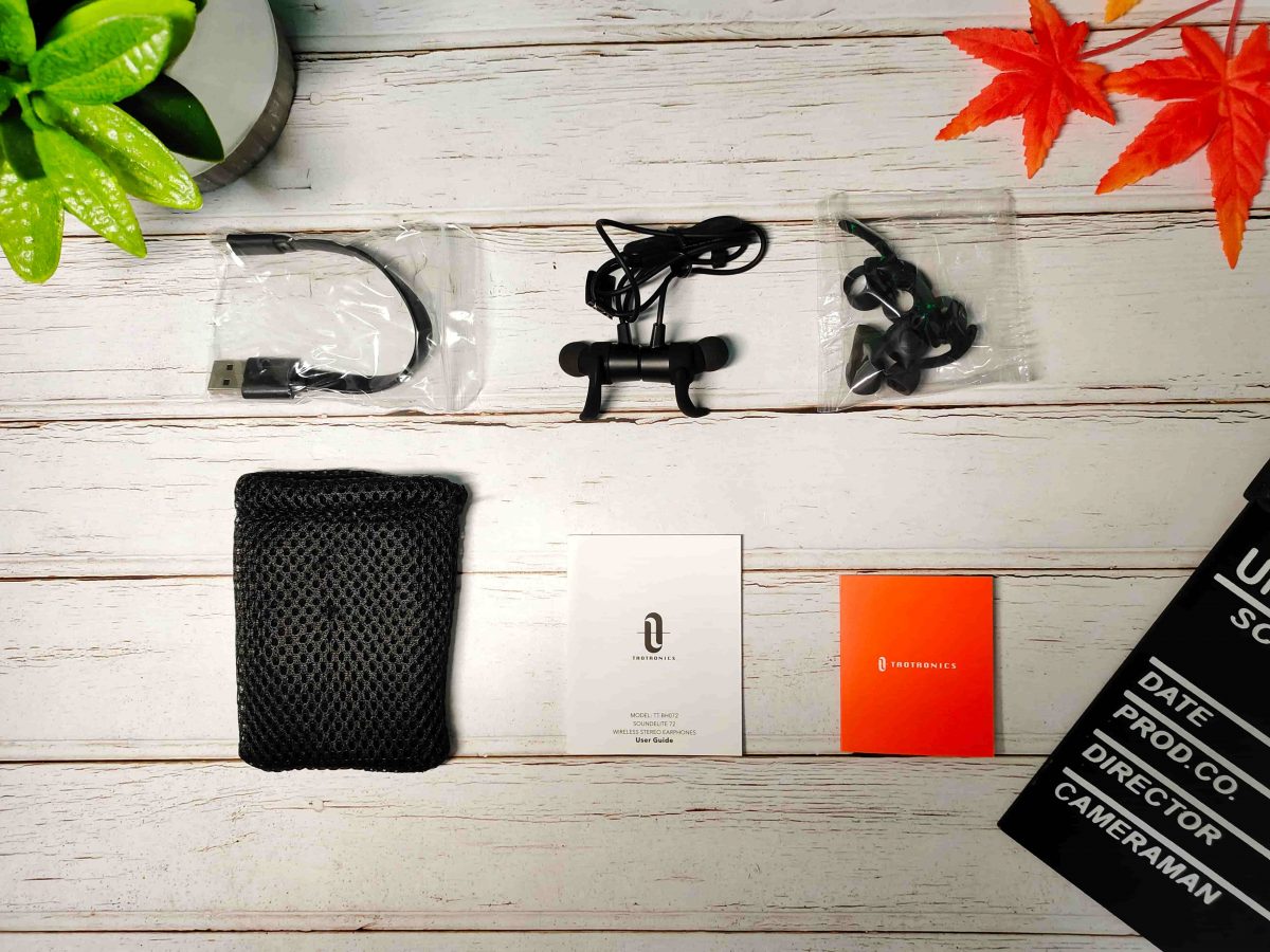 拆開包裝後取出所有包裝內附贈的物件。TT-BH072 運動藍牙耳機在智選家上售價不到一千五,但以包裝的豐富度來說,完全對得起這個價格。取出所有配件後可以看到包裝中含有:
