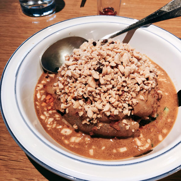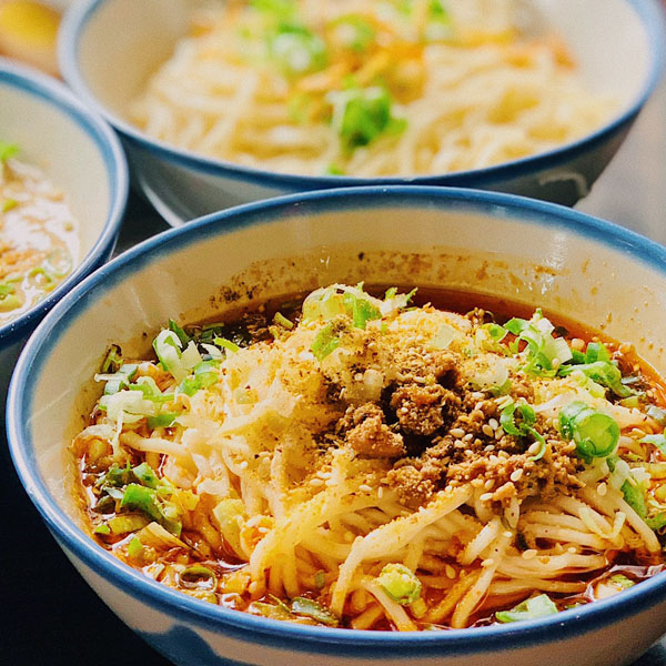 蘭芳小麵的靈感來源取自四川重慶小麵,用18種辛香料調出花椒油做調味,圓細麵泡在紅油裡,細碎的榨菜末、肉燥末、香菜、青蔥還有白芝麻,拌勻後每一口都能吃到高層次滋味,嗆辣的麻椒香就算頭皮冒汗也停不下來!