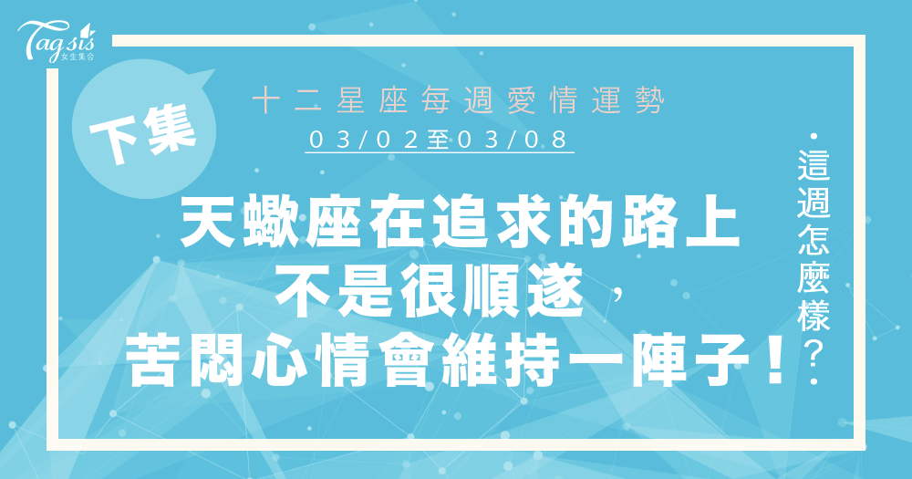 【03/02-03/08】十二星座每週愛情運勢 (下集) ~天蠍座在追求的路上不是很順遂,這種苦悶的心情還會維持一陣子!