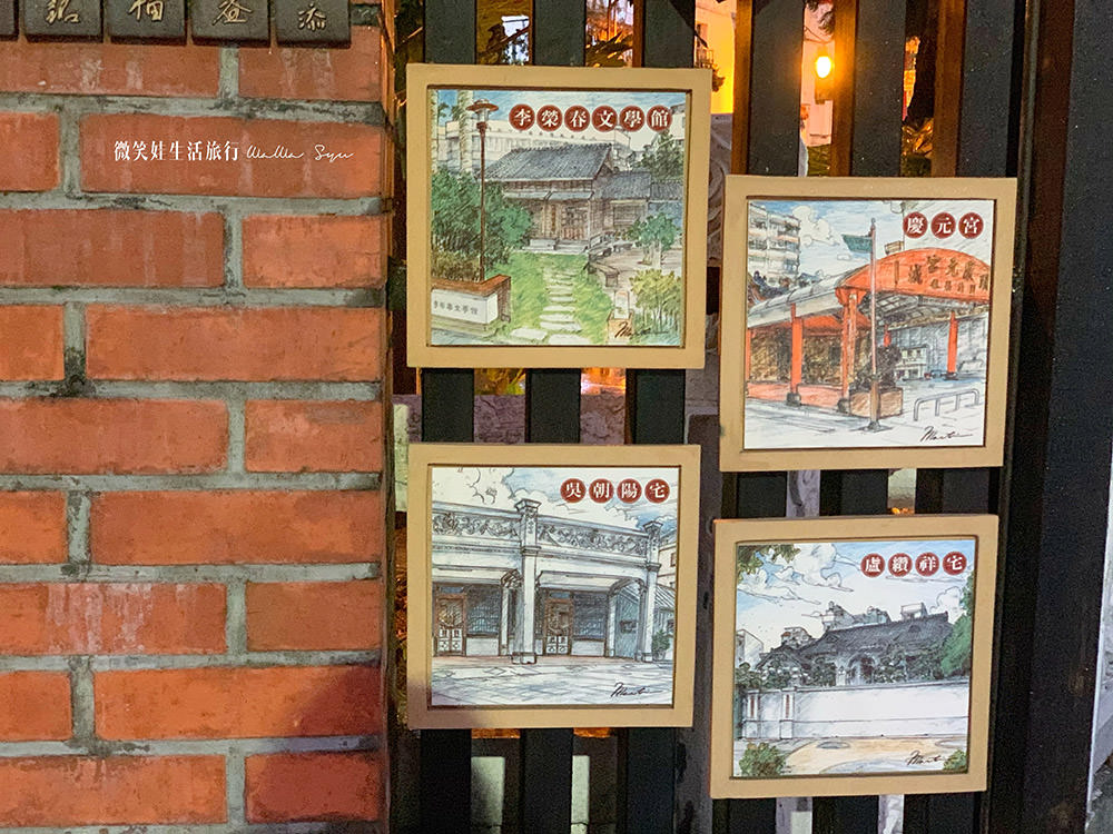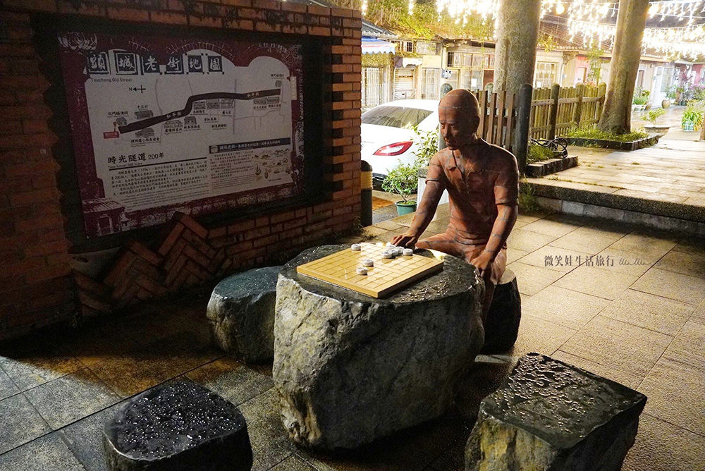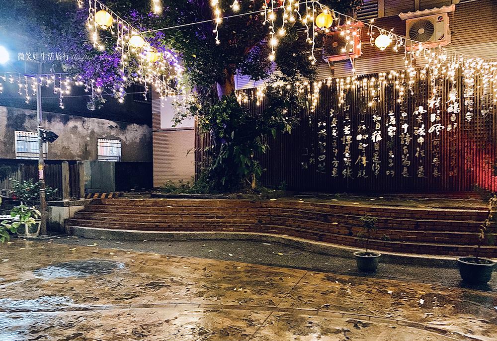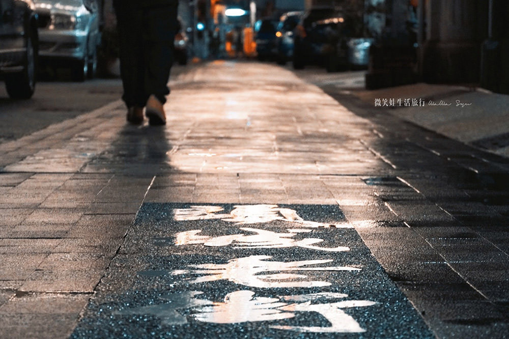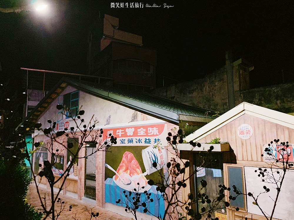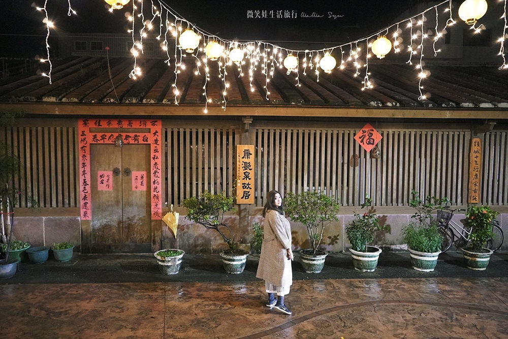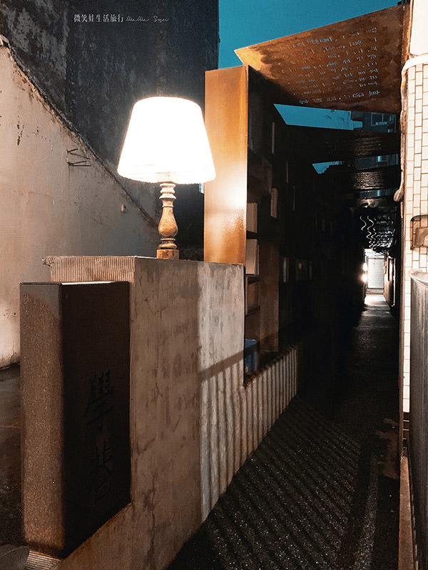 在前後兩側到了夜晚還有超巨型的桌燈亮著,牆面展出的是鄉土小說家李榮春的創作 – 烏石帆影!可惜燈實在太暗無法拍攝出從底下往上望那些文字透光出來的感覺,讓我超想為了這條巷子想要白天在衝一波!所以真的強烈建議如果來這邊玩最好安排一整個下午到晚上。