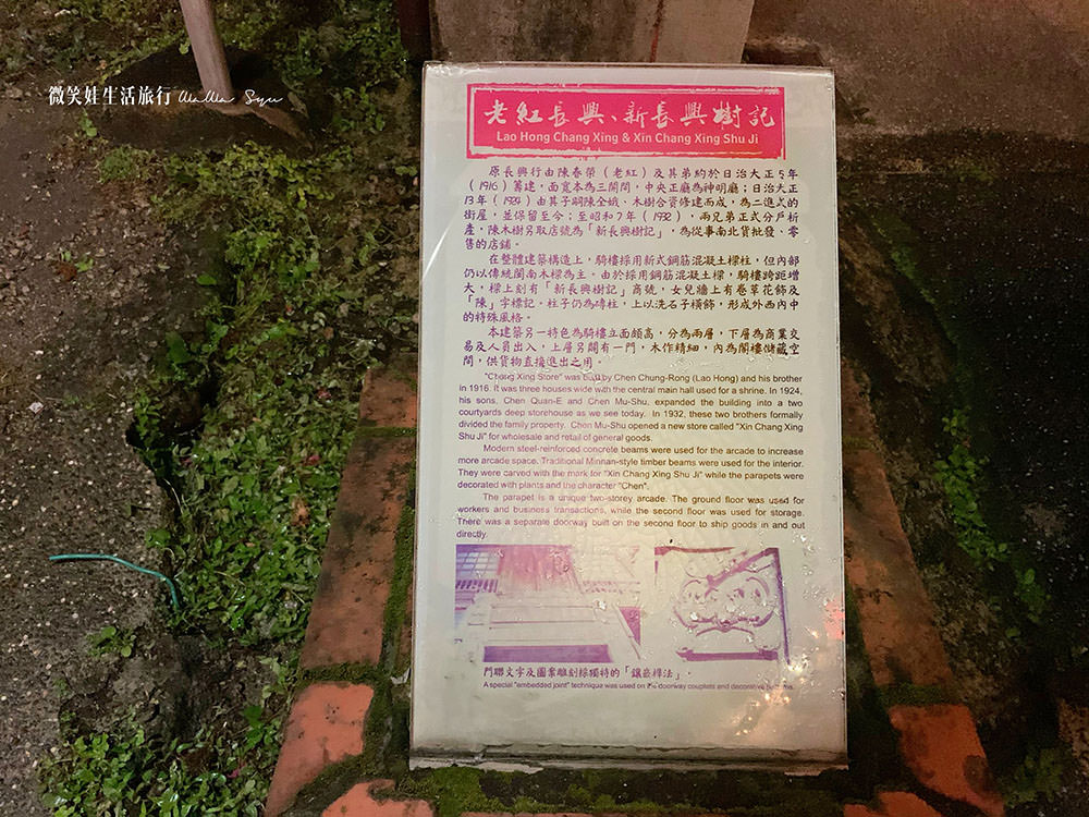建築特色屬於昭和時期建築風格,臨街騎樓的西洋式橫條山牆,建材是使用鋼筋混凝土及洗石子(宜蘭超多這種建材),騎樓支撐柱則以洗石子搭配紅磚,相當大器可以看出當年的繁榮之際,不知道是因為點燈的關係嗎?讓微笑娃彷彿路前似乎重現熱鬧非凡的景象散景而過。