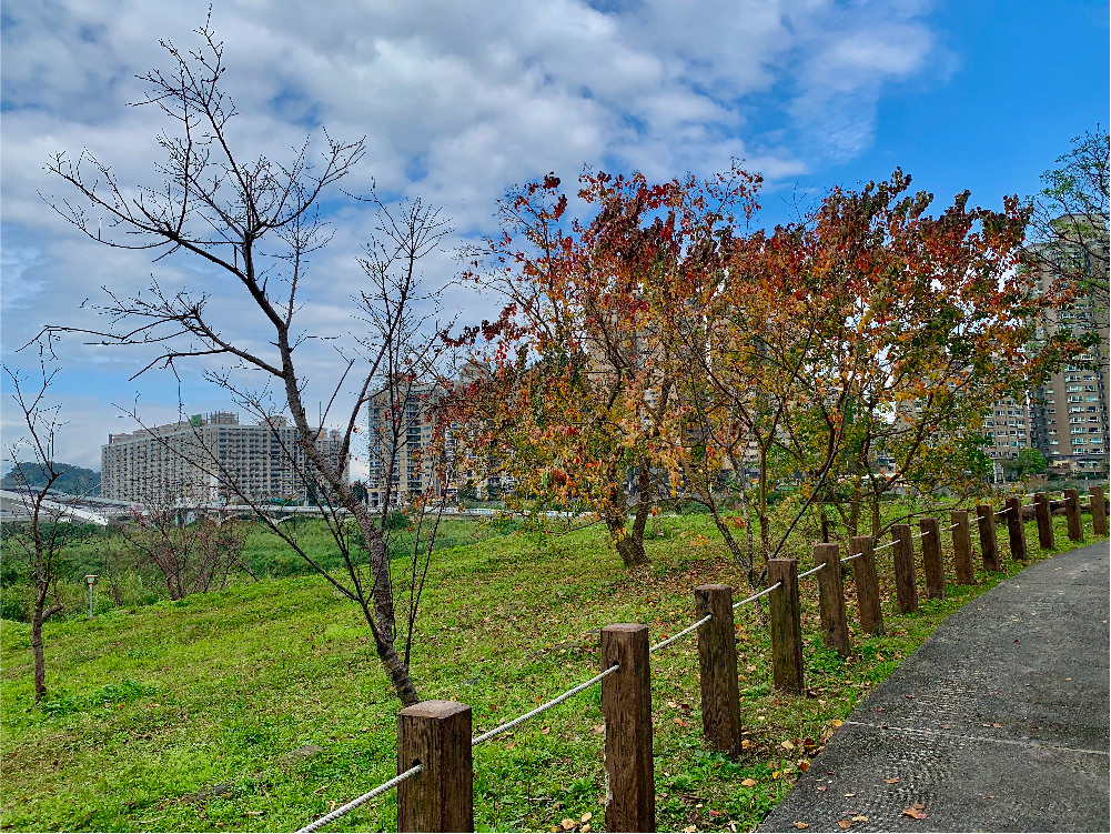 在直排輪區剛好有一灘水,與欄杆跟湛紅的樹成為一處美景,這裡也超好拍