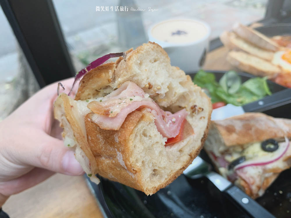 三明治系列也是ALL DAY常客常點的,服務人員也大力推薦,ALL DAY的三明治共有五種口味,而我選擇了帶皮火腿三明治,麵包本體是使用法國長棍麵包,經過烘烤過讓後表皮呈現酥脆並帶有咬勁的口感,內餡則是帶皮的薄片火腿配上兩種乾酪(卡門貝爾乾酪、哈代第切片的乾酪)添加香氣與口感,尤其是哈代第切片乾酪沒有特殊香氣跟搶味的起司味,反倒有淡淡的奶香還會微微牽絲,卡門貝爾乳酪(camembert) 奶味香濃、口感綿密放上充滿特殊香味的黑橄欖切片,不但讓食材顏色加分也多了黑橄欖香味加上好許的芥末籽醬,這我每咬一口都不得不說他真的超好吃!我個人超推薦。