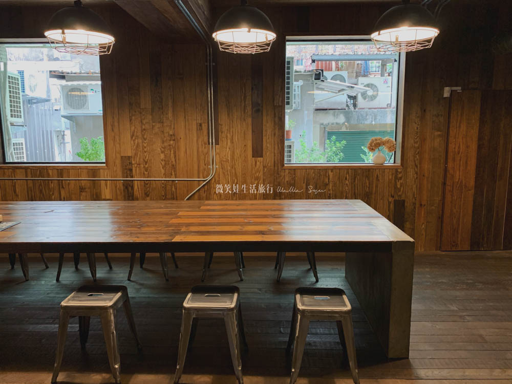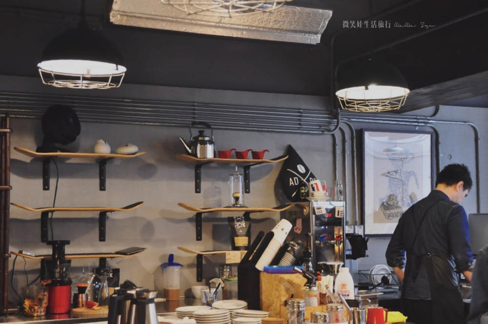 寬敞的前廳路線還保留著幾個讓腳踏車可以帶進來的空間,這也剛好呼應到民生奢區的特殊地理,雖然說從捷運站南京三民站可以步行到這,但是其實快走也需要10幾分鐘,對於有些人來說會選擇騎腳踏車在這最有名的林蔭大道順路著過來,而腳踏車也成了愛運動、愛環保人士選擇的另一種交通方式,也很難得能將自己的寶貝愛車放進咖啡廳陪伴一起享受午後,而在室內還看到老闆似乎也是一個愛運動的人,舉凡腳踏車、衝浪板,都可以在裡面看到,更特別的是ALL DAY的吧台區,放置咖啡還有裝飾品的層板是使用滑板!是不是很特別呢!