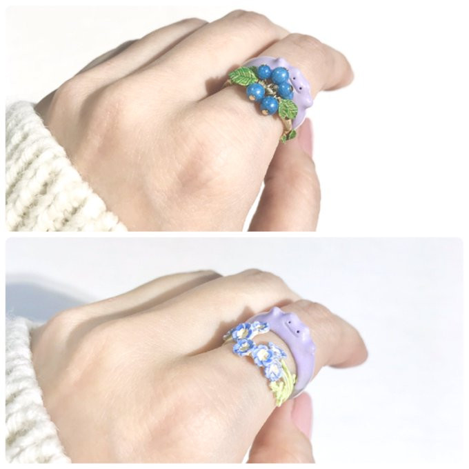 可以變成任何形狀的百變怪,這次變身成了圓戒指,只露出臉部及小小的雙手,超可愛外型搭上淡紫色,讓人超級想收來戴!Palnart Poc也替「百變怪戒指」搭配了六種不同的戒指組合,像是「藏在果實裡的百變怪」及「粉蝶花田與百變怪」這兩款,使用果實及花朵配件,給人滿滿的春天氣息,跟百變怪一起度過春天~