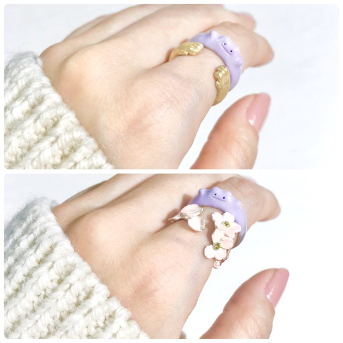 還有「被抓住的百變怪」是搭配金色小手造型的戒指,好像抓到了百變怪一樣,小手跟百變怪擺在一起超級可愛!另一個「賞花中的百變怪」則是使用櫻花造型的戒指,營造出百變怪在賞櫻的模樣,給人帶來浪漫的感覺~