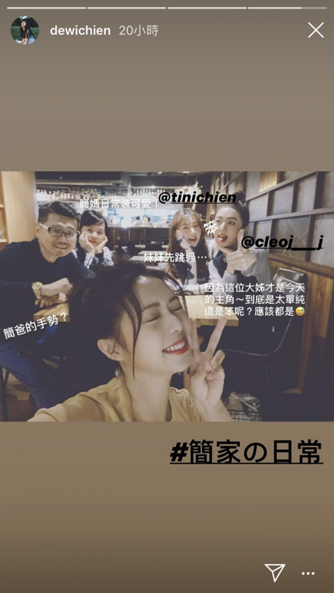 而簡婕也在 IG 限時動態突然 PO 出一則影片,寫著「我就爛」三個大字,似乎心情受到一些影響。她的妹妹簡廷芮也貼出全家吃飯的照片,並在簡婕旁邊加上「笨」字,補充「這位大姐才是今日主角~到底是太單純還是笨呢?應該都是」,可見對姐姐有些心疼。