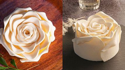 以層層白巧克力花瓣包裹著香草戚風蛋糕體,內餡選用溫柔又甜蜜的海鹽香草風味,佐上香醇奶油起司抹醬更為風味增添淡淡尾韻,每一口都是濃情蜜意!