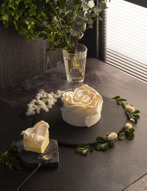 「白色戀人」玫瑰蛋糕,由職人手捏的白色花瓣超級仿真,整顆蛋糕由內而外的淨白優雅仿如天使聖潔的愛神邱比特。