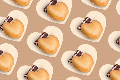在特製愛心型貝果中夾入濃郁花生碎粒奶醬,搭配72%苦甜巧克力製成的米香布朗尼,香濃又醇厚的滿足不禁憶起一次次開心記憶。