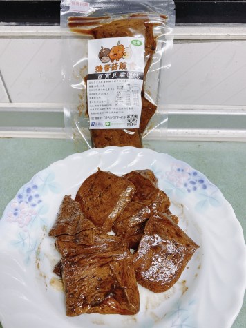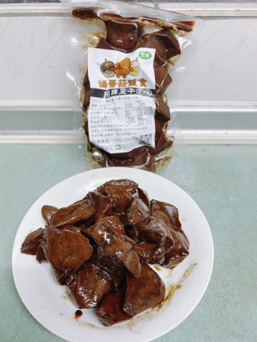 切成方塊大小形狀的豆干,口感富有嚼勁,用了純釀醬油、糖、鹽、中藥辛香料和香油去滷,滷的非常入味,鹹中帶點甜的味道很下飯
